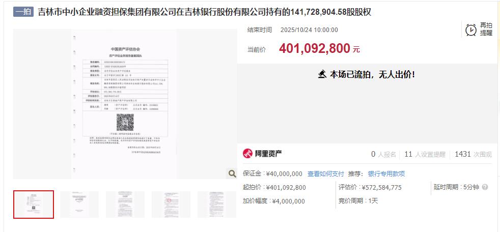 中国经济网北京10月27日电 据司法拍卖平台显示,吉林银行1.4亿股、哈尔滨银行1.5亿股竞拍已于10月24日结束。由于没有人出价,两家公司都没有举行拍卖。 “吉林省中小企业融资担保集团有限公司持有的吉林银行股份有限公司141,728,904.58股”拍卖信息表明当前价格为40109.28万元,结束时间为2025年10月24日10:00。该拍卖已被拒绝,无人出价。上述股票估值为572,584,775元。评估基准日为2024年12月31日,起拍价40109.28万元,保证金4000万元,加价400万元。根据“151310124 B”的拍卖信息哈尔滨境内非上市股份(证券代码:HK6138)”,现价为269,029,390元,截止时间为2025年10月24日10:00。本次竞价已被拒绝,无人竞价。上述股票的评估价格为384,327,700元,起始价格为269,029,390元, 代管3000万元,加价100万元。经测算,吉林银行、哈尔滨银行上述权益的估值合计为9.57亿元。