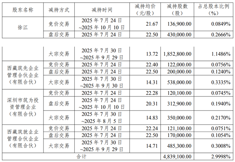 中国经济网北京10月27日电 筑博设计(300564.SZ)10月24日发布关于其现任管理层、合作方及持股5%以上股东终止减持计划的公告。 2025年7月2日,公司披露了对实际控制人之一(持股5%以上股东)深圳竹伟、西藏竹仙企业管理合伙企业(有限合伙)(以下简称“竹仙合伙企业”)、先生投资管理公司(有限责任公司)(以下简称“竹墙会”)及股东的减持计划。 西藏竹玖企业管理协会(责任公司)(以下简称“竹玖合伙企业”)。近期,我公司收到股东徐江、朱贤合伙公司、朱伟合伙公司、朱九合伙公司《关于减持计划到期的通知》。截至本公告日,上述减持计划已到期。公告显示,徐江、朱贤合伙公司、朱伟合伙公司、朱九合伙公司合计减持483.91万股,折算现金约8087.2万元。筑博设计表示,此前的股份减持是按照相关规定提前申报的。截至本公告日,本次减持计划期限已结束。上述减资进展与此前披露的减资承诺及计划一致。此次减持计划也不存在违反承诺的情况。本次减持计划的实施不会对我们的股份产生重大影响治理结构、资本结构或持续经营,不会导致我们的控制结构发生变化。徐江现任本公司董事、副总经理、控股股东,为实际控制人的共同行动人。筑贤合伙企业、筑伟合伙企业、筑久合伙企业的执行合伙人为公司控股股东、实际控制人徐贤林;他们形成合作的行为关系。据筑博设计2024年年报显示,该公司实际董事为徐贤林、徐江。许仙林和许江是兄弟,许仙林和许江是搭档。筑贤合伙企业、筑伟合伙企业、筑久合伙企业是我们实施的股权平台。徐先林先生为珠贤合伙企业、珠伟合伙企业及珠杰合伙企业的执行合伙人。马振彦先生为珠伟合伙企业及珠杰合伙企业的有限合伙人。筑博设计是2019年11月8日在深圳证券交易所创业板挂牌上市,发行数量2500万股,发行价格22.69元/股。保荐机构(主承销商)为中信证券股份有限公司,保荐代表人为庄云志先生、于洪刚先生。公司上市发行募集资金总额为56725万元。实际扣除发行费用后净利润为51,158.58万元。根据上市前发布的招股说明书,公司拟募集资金51158.58万元,将用于设计服务网络建设项目、装配式建筑及业务研发及产业化项目、BIM休闲、技术研发中心建设项目(深圳)、高原建筑研究中心建设项目等信息系统建设项目,以补充流动资金。公司发行费用总额为5,566.42万元,其中订阅及赞助费用3871.23万元。 2021年度股票分红实施公告显示,以总股本10287万股为基数,向全体股东每10股派发现金红利600万元(含税及税后)。 QFII、RQFII、首发前限制性股票和证券投资基金持有者每10股获得540万元奖励。个人股息税对于持有限制性股票的人来说是不同的。IPO后股票、股票激励的限制性股票和无限售条件的流通股。按适用税率纳税。公司暂不代扣代缴所得税。个人转让股票时,按照持有期限计算纳税义务。同时,以资本公积金向全体股东每10股转增股本至600万股。该股的股份登记日期派息日为2022年7月7日,除权及分红日为2022年7月8日。公司2021年至2024年营业利润分别为10.26亿元、8.76亿元、6.81亿元、4.36亿元。归属于上市公司股东的净利润分别为1.71亿元、1.5亿元、8299.97万元、3098.48万元。扣除非经常性损益后,净利润分别为1.1亿元、9067.3万元、3427.98万元、-3267.7万元。经营活动产生的现金流量净额分别为4,185.61万元、6,256.68万元、4,234.86万元、899.15万元。 2025年上半年,公司实现营业利润1.23亿元,同比下降34.76%。归属于上市公司股东的净利润为-2139.55万元(上年同期为-3031.7万元)。市属企业股东非净利润下降6539.65万元(去年同期为5884.24万元)。经营活动产生的现金流量净额为负3,659.6万元,去年同期为9,299.71万元。